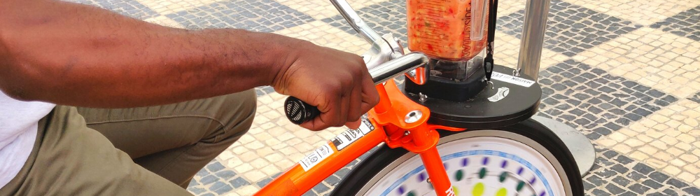 Le vélo-mixeur fonctionne de manière ludique, à la force du mollet. Quelques fruits dans le blender à l’avant du vélo, du jus de fruits et quelques coups de pédales, c’est tout ce qu’il faut pour déguster un délicieux smoothie.